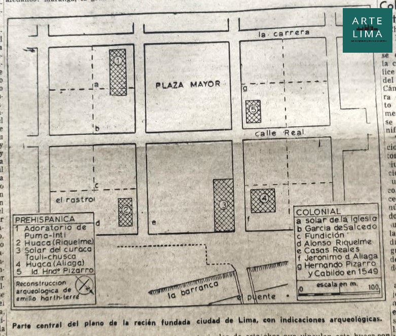 ¿Había huacas en la Plaza Mayor de Lima? Por muchos años se dio por verdad la existencia de templos y palacios prehispánicos sobre los cuales los españoles fundaron “La ciudad de los reyes”. Fue el eminente arquitecto Emilio Hart-Terré quien a partir de sus propias investigaciones propuso tal realidad, como lo vemos en este artículo del diario “El Comercio” de enero de 1960. Lo cierto es que con el tiempo esa idea ya se ha superado y hoy se hace muy difícil aceptarla.